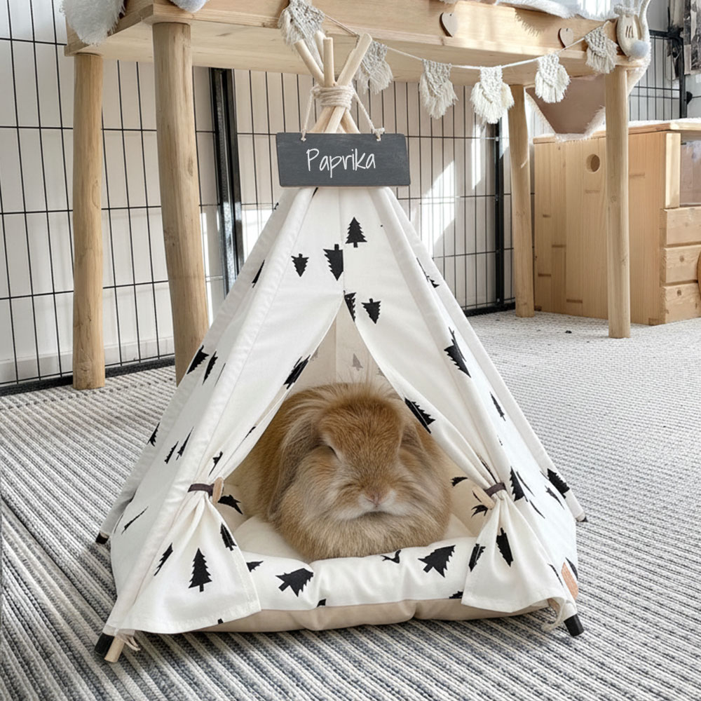 ¿Buscas una cabaña para conejo diferente? Este tipi para conejo con estampado de abeto es justo lo que necesita. Y admítelo… te vas a derretir al ver a tu conejo dentro 😍.