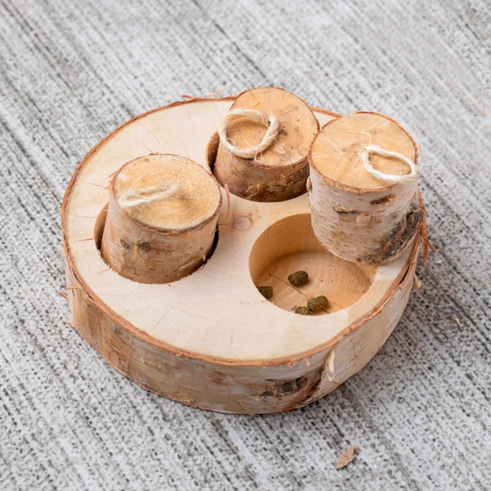 Dit interactieve konijnenspeeltje is gemakkelijk te gebruiken. Je speelkameraadje moet zijn lievelingssnoepjes vinden die je van tevoren in de 3 houten holletjes hebt verstopt. Hij hoeft alleen maar de houten stammetjes op te tillen om de lekkernijen te pakken.