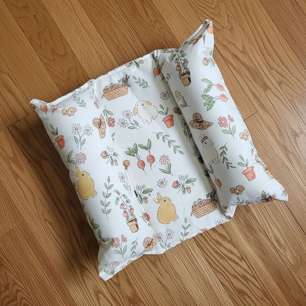 Dit konijnenbed wordt ook wel een snugabun genoemd: een omhullend kussen met twee rollen aan de zijkanten, speciaal ontworpen zodat jouw konijn zich heerlijk in het midden kan nestelen, stevig gesteund en geborgen. Hij zakt er niet zomaar in weg zoals op een gewoon kussen: hij krult er echt in, voelt zich veilig, net als in een klein nestje. Het is zacht, geruststellend en je zult snel zien hoe hij zich er helemaal ontspant.
