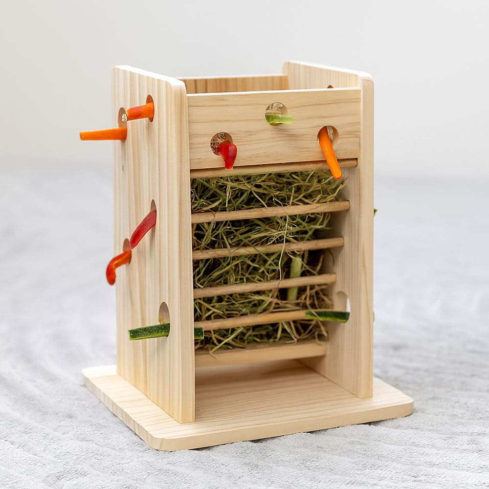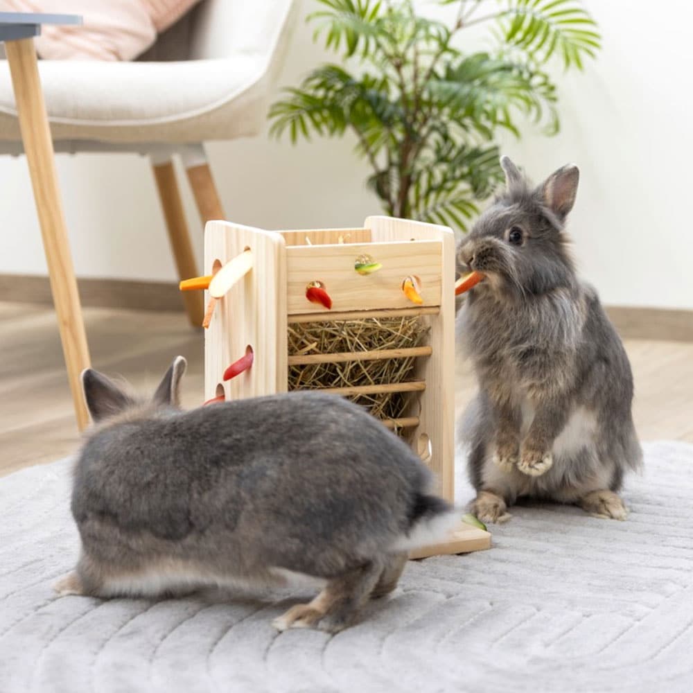 💡 Tip: Vul de ruif met hooi en verstop enkele gezonde snacks (wortelschijfjes, stukjes appel of witlof) in de openingen. Je konijn zal al snel verzot zijn op deze kleine speurtocht. Het resultaat? Ze hebben plezier, blijven actief en—belangrijker nog—genieten eindelijk van hun hooi!