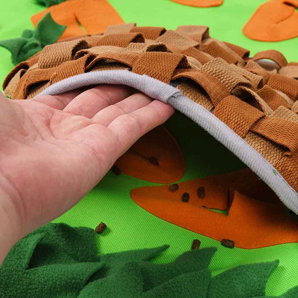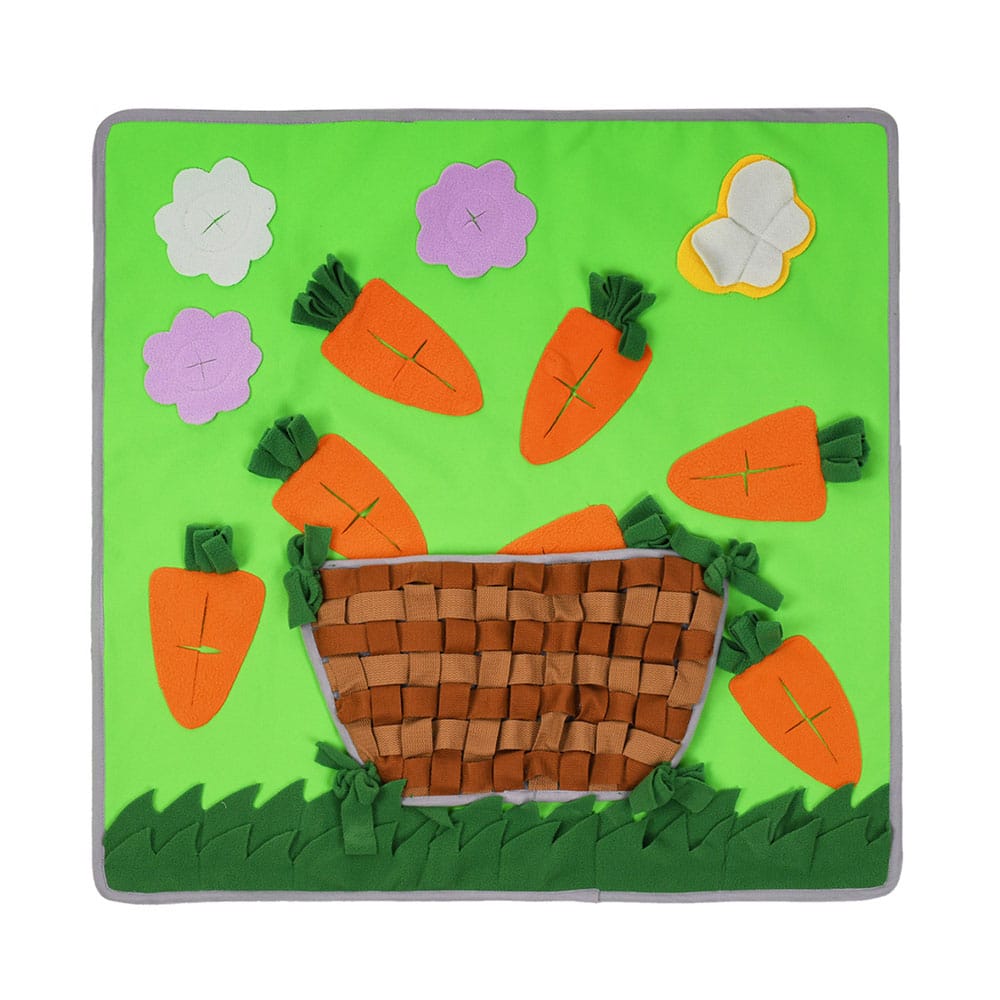 Deze Verrijkende snuffelmat konijn heeft de vorm van een antislip vierkante stof, die een mand met opgenaaide wortels in reliëf op het oppervlak bevat.
