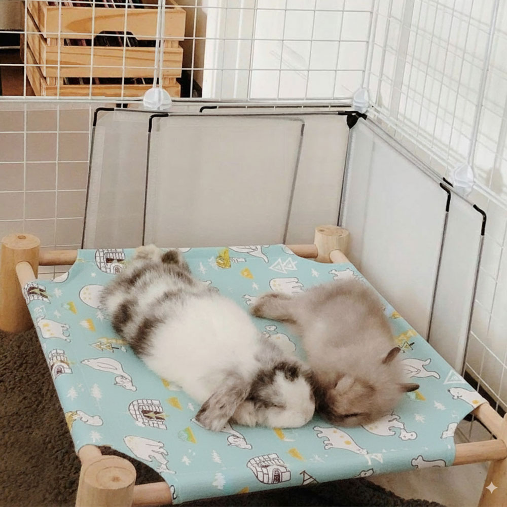 This isn’t just a rabbit hammock, it’s truly the wooden rabbit bed they’ll never want to leave. And for good reason: slightly raised, with a tightly-stretched canvas that’s super comfy under their paws, it offers soft comfort while staying airy. Perfect for relaxing, dreaming about their favorite pellets… or turning their back on you in style after a grooming session that was just a bit too long. 😅