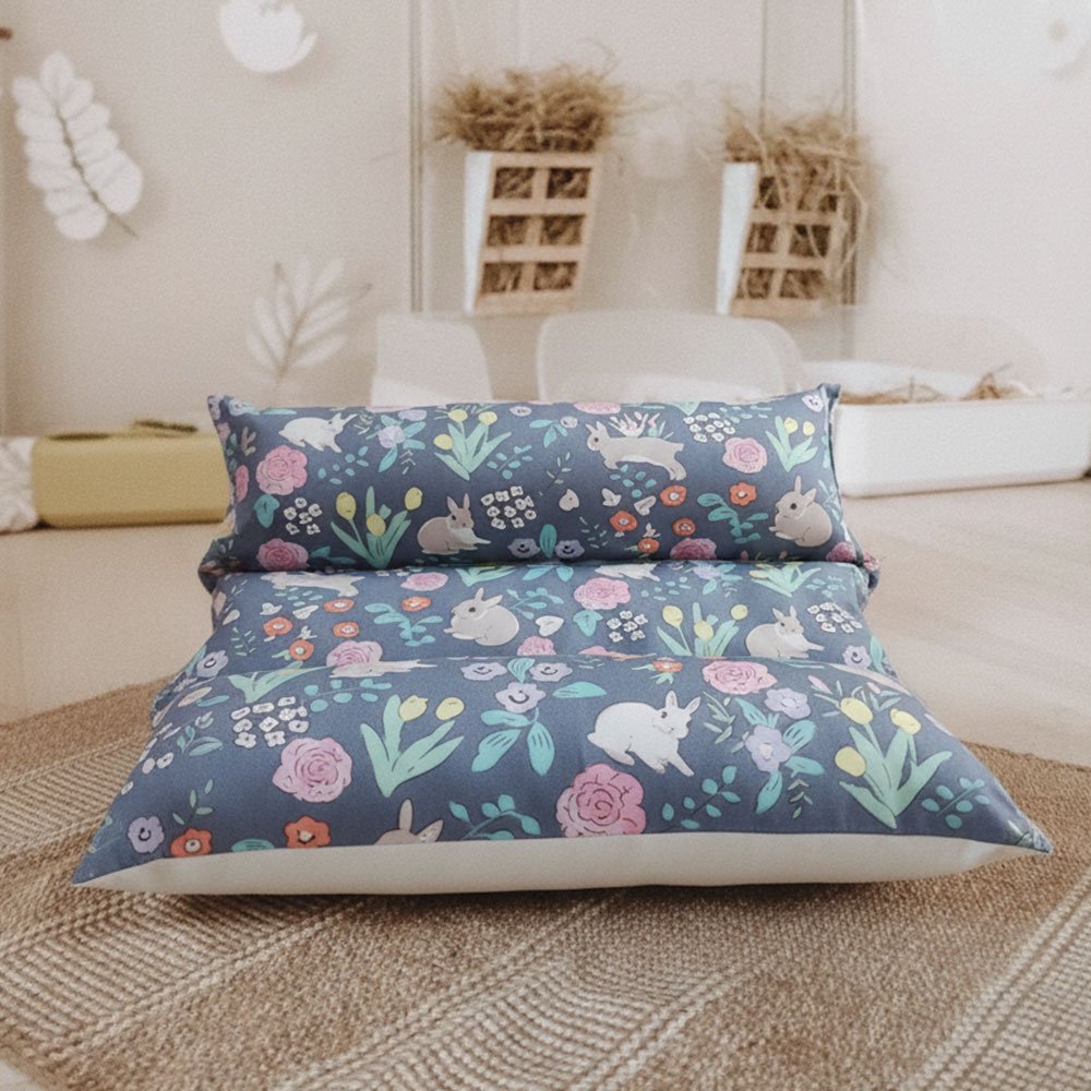 The Midnight pattern is that enchanting touch we all love: a deep blue background sprinkled with sweet flowers and little dreaming bunnies. This rabbit bed instantly turns their nap corner into a real cocoon worthy of a fairy tale 🌙✨