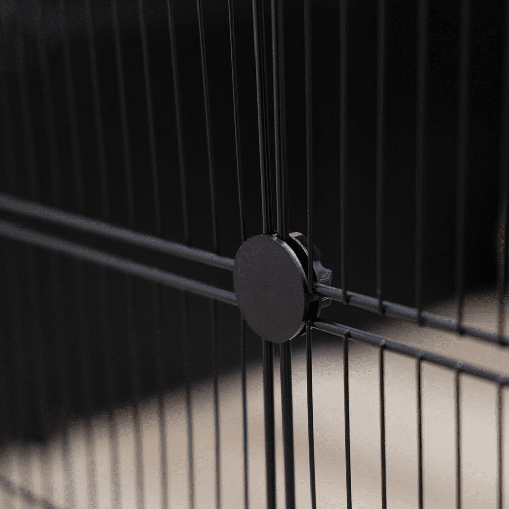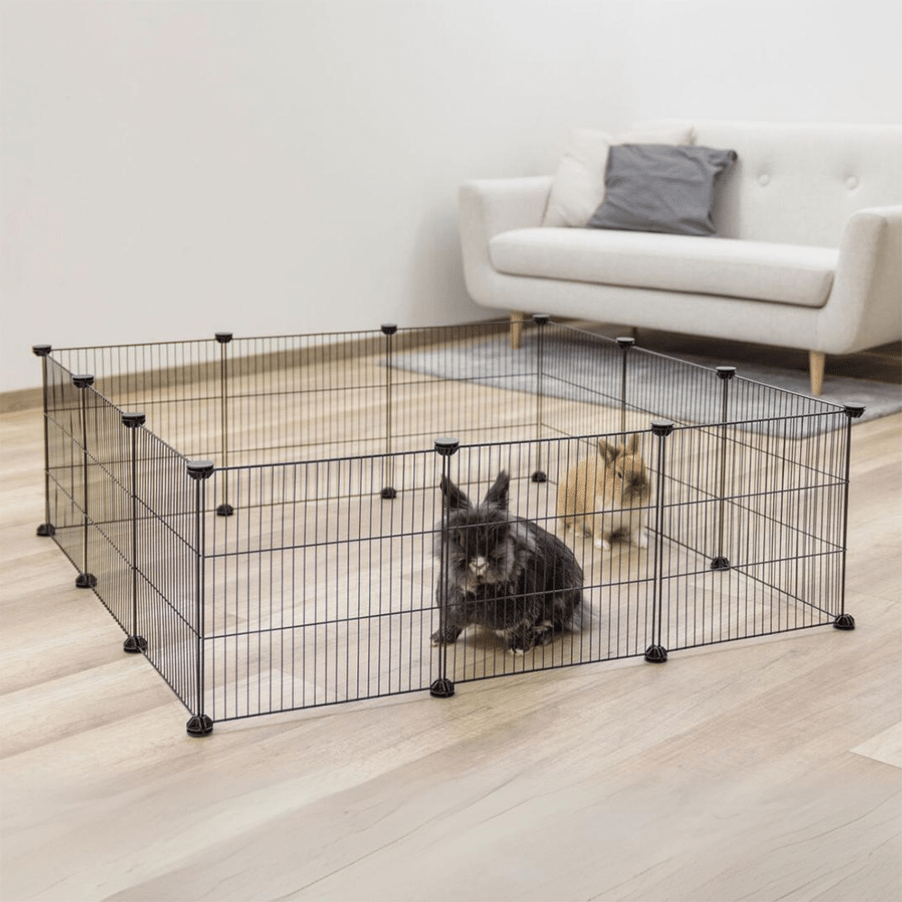 You can take several sets of panels to increase the size of your rabbit’s enclosure. A square panel is 35 cm, so all you have to do is calculate the number of panels you need.
