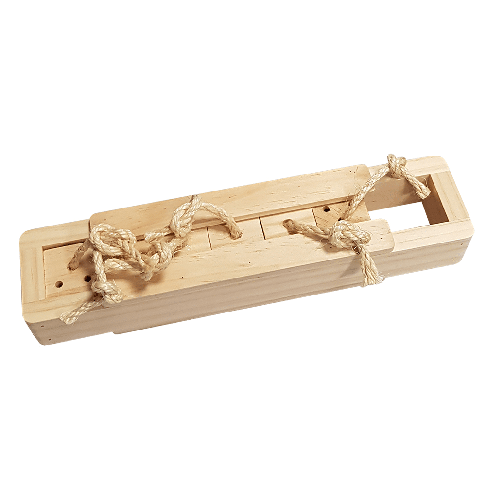 How do you play? It’s really quite simple! Hide a small treat in the compartments, cut into several pieces – it could be a small piece of apple, for example. You’ll instantly see your rabbit trying to retrieve his treat by pulling on the strings. Your bunny will be so proud of himself every time he finds one!